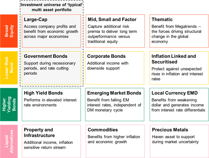 That’s exactly how the Transact – BlackRock MPS portfolios are constructed. The asset allocation spans a wide spectrum of differentiated exposures: developed and emerging market equities, sector-specific and thematic strategies, factor tilts, government bonds, inflation-linked bonds, investment-grade and high-yield credit, emerging market debt, commodities, property, gold and precious metals. And as we discovered last month, currency exposures are hedged strategically. The diagram below illustrates our ‘four pillar investment universe’, each component is included not just for its standalone return potential, but for its role in enhancing the overall efficiency and robustness of the portfolio – giving clients access to a more diverse set of return drivers.