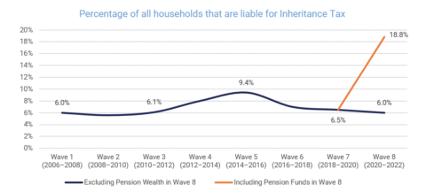 Excluding pension wealth, we can see a reduction in the percentage of households liable from Wave 5 to Wave 8, from 9.4% to 6.0%. The primary reason for this reduction is the inclusion of the final phases of the RNRB.